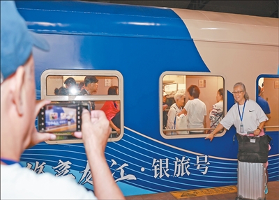 On August 22, tourists posed for photos in front of a tourist train at Harbin Railway Station in Heilongjiang province. On the same day, tourist train No. Y891 departed from the station for a five-day grassland tour, marking the launch of Heilongjiang's first "Leisurely Longjiang ? Silver Travel" special train for seniors this year. The train has been refitted with age-friendly facilities by the Harbin railway department to improve the travel experience for elderly passengers.