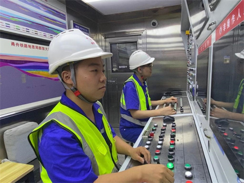 沿著(zhù)最大坡度10%的一號斜井下行沒(méi)多久,就遇到“馱”著(zhù)3片每片重量達14噸左右管片緩緩前進(jìn)的雙頭運輸車(chē)?!肮芷嵌軜嬎淼赖闹饕b配構件,主要用于為隧道打造一圈保護屏障,‘甬舟號’盾構機承擔著(zhù)24680塊管片的拼裝任務(wù),拼裝由作業(yè)人員利用拼裝遙控器完成,新技術(shù)對工程質(zhì)量管控和效率提升都有很大幫助?!壁w大彬說(shuō)。