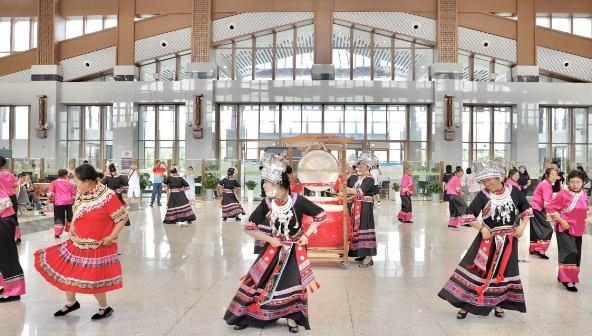 6月18日11時(shí),在渝廈高鐵黔常段龍山北站的候車(chē)大廳里,一群身著(zhù)土家族盛裝的表演者從旅客中奔跑而出,激昂的鼓點(diǎn)響起,與響亮的鑼聲交替,奏出鏗鏘鼓點(diǎn)樂(lè )聲。頭戴銀飾的土家姑娘巧笑倩兮,阿婆阿公精神抖擻,踏著(zhù)鼓點(diǎn)節拍,甩動(dòng)雙臂,旋轉跳躍。一場(chǎng)氣勢磅礴的擺手舞在龍山北站候車(chē)大廳快閃,瞬間成為焦點(diǎn),引得候車(chē)旅客紛紛駐足觀(guān)看。